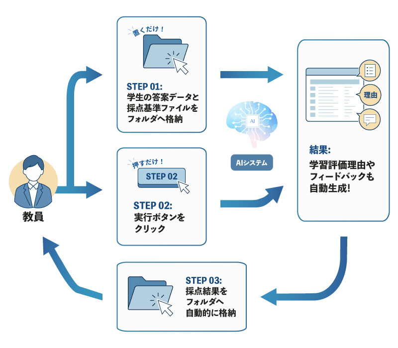 教員一人ひとりに共有フォルダをアサインし、授業ごとのフォルダに課題レポートを格納するだけで、AIによる一次採点を自動実行。